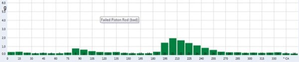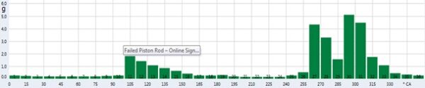 As we have demonstrated certain failure modes show majority of energy at higher frequencies (e.g., 4 – 7 kHz). This is why we suggest following API 6701 and employ full signal bandwidth 0 – 7 kHz ideally combined with a segmented RMS analysis – this way repetitive impacts are not missed at critical stage and RMS based segments represent a solid (e.g., 10°crank angle) weighted average, and single isolated signal spikes do not lead to nuisance alarms, which may occur using unfiltered peak analysis.