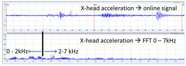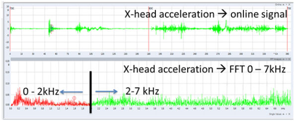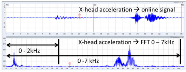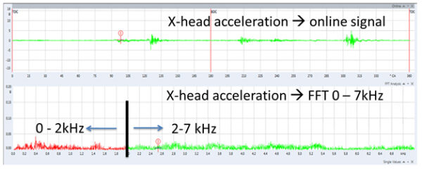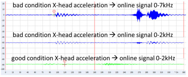 The failure however becomes obvious inside the online data set “bad” at 0-7 kHz (Figure 9 top) which shows a significantly different picture and lot of energy around 270° crank angle (CA) and 300°CA not visible in the “bad” 0-2 kHz filtered online data (Figure 9 center).