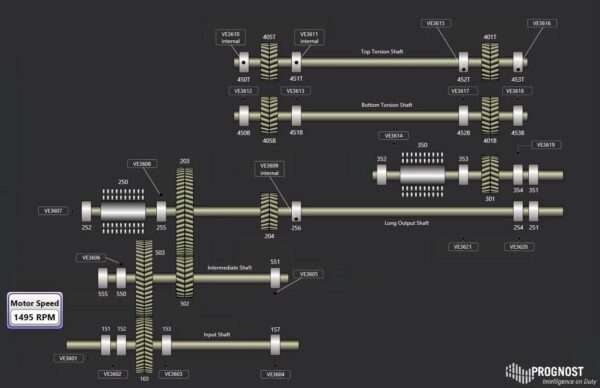 The gearbox overview in the PROGNOST®-Predictor GUI (Graphical User Interface) displays all components in one view. This makes it very convenient for the user to understand the layout of the gearbox and to locate a defective component.