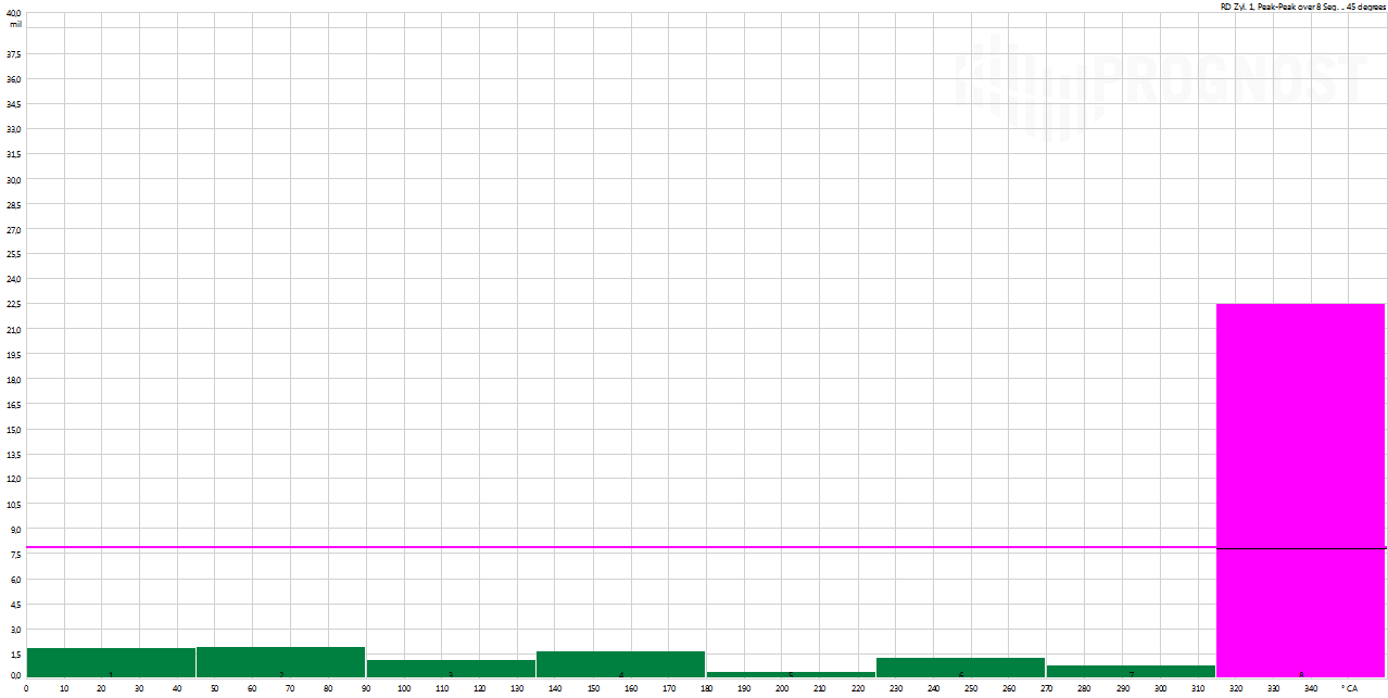 For a detailed analysis, it is necessary to examine the signals revolution by revolution to understand the sequence of this event. The revolution-based analysis is possible with the ring buffer, which is automatically triggered, records all signals and analyzes subsequent root causes. This enables the machine operator to determine the failure – with all information recorded seven minutes before and three minutes alter this event (here: 1000 revolutions).