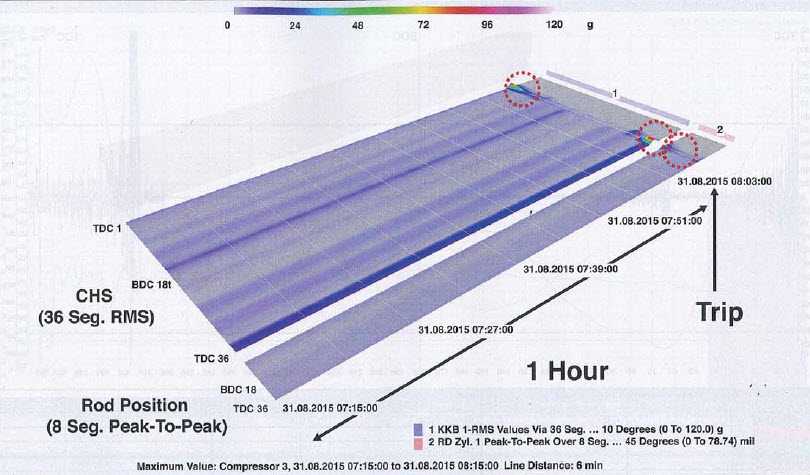 The piston rod failure was abrupt with zero early indications. Figure 2 shows the analyzed crosshead RMS vibration (more than 36 segments = 360° crank angle = 1 revolution) and the piston rod position peak-to-peak value (eight segments) over one hour in a 3-D waterfall view.